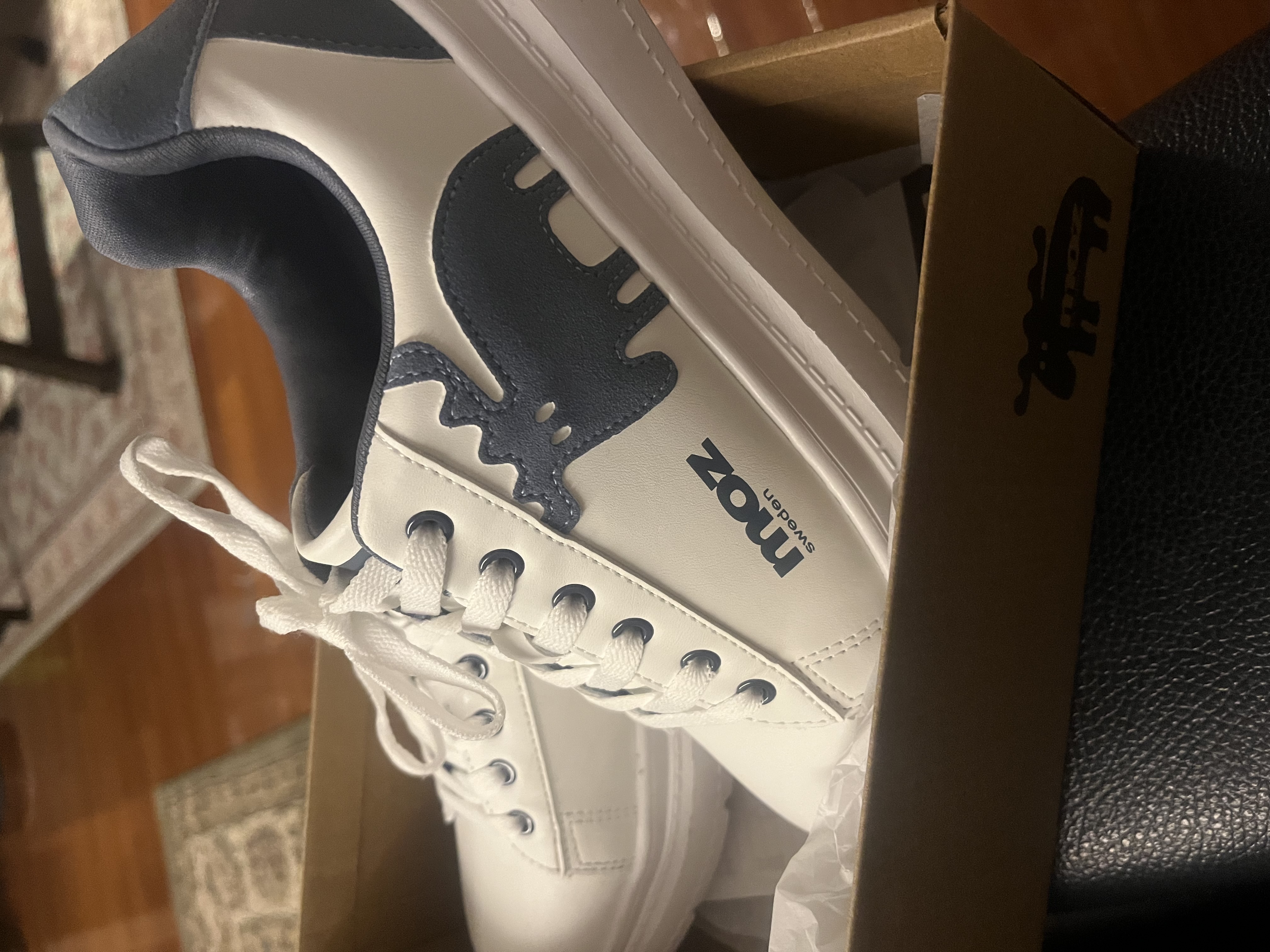 両サイドロゴ、バックのシルバーホログラムが気に入って購入。 両サイドロゴは光の角度によって色が変わって見えるのかなと思ってましたが右/赤系、左/青系で固定されていて色が変わるものではなかったです。 履き心地は、通常23cm幅広3E以上着用でM23-23.5にしましたが、つまさきがやや細めで小指がキツイです。長時間は履けないです。近所用です。 もう1つ購入したmözのスニーカーは23.5でゆとりある履き心地だったので、デザインによる足幅の違いもあるかと思いますがM表記と0.5表記とで違うのが分かり今後の参考になりました。 素材はとても軽く丈夫で擦れ・砂汚れにも強いです。小雨程度なら滲みずに履けます。